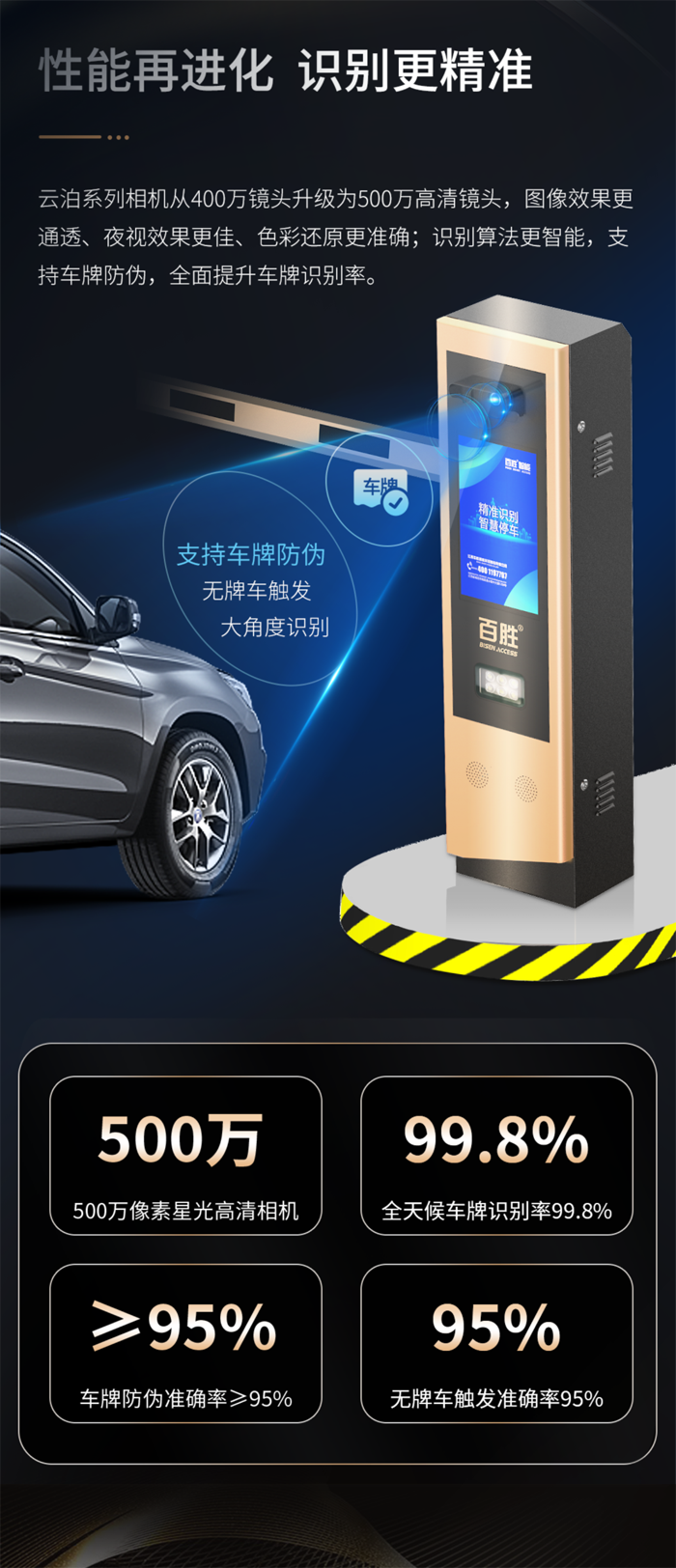 云泊系列相機(jī)從400萬(wàn)鏡頭升級(jí)為500萬(wàn)高清鏡頭,圖像效果更通透、夜視效果更佳、色彩還原更準(zhǔn)確;識(shí)別算法更智能,支持車(chē)牌防偽,全面提升車(chē)牌識(shí)別率。
